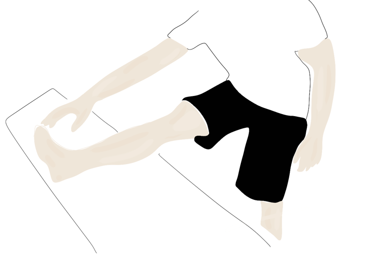 Debout, patient doit fléchir hanche à 90° (pied posé sur table d’examen) puis aller toucher sa pointe de pied